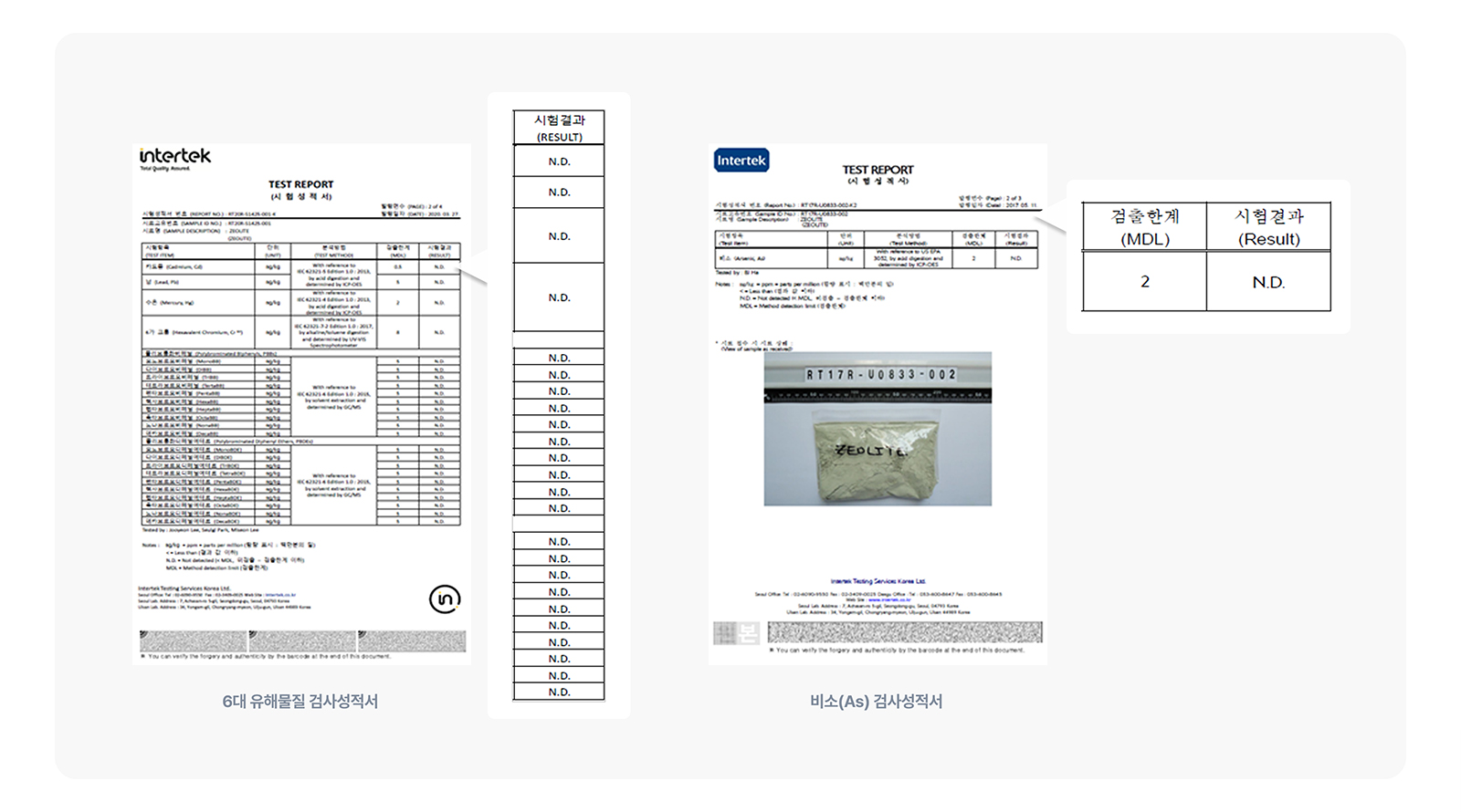 렉셈 제올라이트는 1회/년 이상 정기적으로 공인기관을 통해 유해성분 검사를 시행합니다.